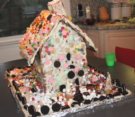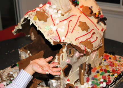 Up to now the process was peacefully and fun. Then the storm hit. A gaggle of children came over to help decorate. Candy and cookies, coconut and confections were set out for decorations. Within moments the carefully constructed house looked like something out of a Dali dream. Little hands alternated between hurling calories at our icing coated structure and stuffing building materials into their mouths. The pitch in the room grew to deafening proportions. Some parents attempted to moderate the madness, most gave in to the inevitable, grabbed a cocktail and searched for quiet locations.