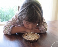 A pluot is a cross between a plum and an apricot…It has a cranberry-blackberry-ish color…with a sweet, slightly tart taste. This recipe is a variation on Nick Malgieri’s Apricot Crumb Cake recipe from the “How to Bake” cookbook. I mixed the ingredients…A chef named Chloe (right) formed and presented the finished product.