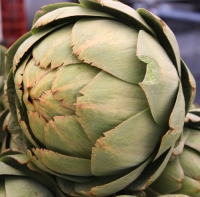 - Trim the leaves of the artichokes, cut off the sharp parts at the top. If using large artichokes cut in half and scrape out hairy chokes. Cut and peel stem. Halve or quarter artichokes.