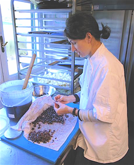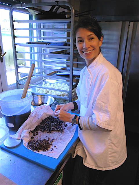 Here I am in the kitchen at the American Academy in Rome. I am pitting black di Gaeta olives to make tapenade. We added blood orange rind and juice to the tapenade.