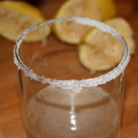 - Rim the outside top edge of the chilled cocktail glasses with a wedge of lemon and then carefully roll the rimmed edge in the sugar until the the top is lightly coated.