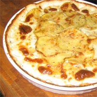 - Make a layer of slightly overlapping potatoes on bottom of baking dish. Pour some of milk mixture over potatoes. Repeat layering potatoes and pouring milk mixture until all are used.