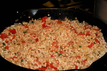 Here’s a great side that compliments many a main course. I’m in love with this toasted couscous because of it’s flavor and size. Israeli couscous is larger than regular couscous and has a firmer texture and stronger flavor — you can really taste the pasta. I jazz it up with tomato, onion and mint and I encourage you to improvise to suit your tastes.