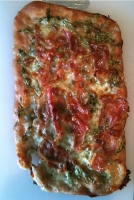 for the picture above I topped the crisp pizza dough with thin slices of prosciutto, homemade tomato sauce, fresh mozzarella and chopped rosemary.
