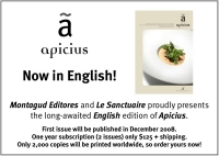 This magazine is designed for professional chefs or culinary enthusiasts. Apicius was first published five years ago in Spain. The magazine then translated in Italian, Japanese, and Deutch. For the first time, we are proud to co-publish this magazine in English. The first edition is going to be in December/January 2009. Limited to 2000 copies.