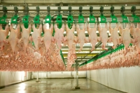 Air chilling on the other hand works by individually suspending birds from a track that moves through two chambers. In the first chamber cold purified air is run over each bird to quickly reduce its temperature. The second chamber lowers the temperature to the desired 32 F to 34 F degree range. That’s it. The frozen chicken is ready for packaging and shipping. No excess water and no excess exposure to the other birds.
