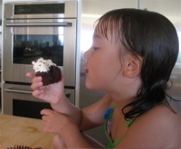 Have you ever gone on vacation and forgotten to pack your pastry bag & tip…for piping frosting onto cupcakes? You can use a Ziploc bag as a substitute. Cut a small slit in one of the bottom corners, fill the bag with frosting, and pipe away…As illustrated by Chloe’s cupcake at right…the result is the same…